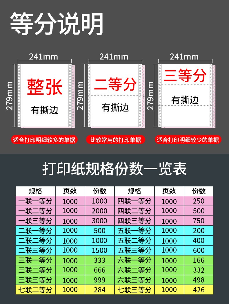 品种齐全,排孔,纸张加工精度高。适用于各种针式打印机,产品表面洁白细腻,打印走纸顺畅,孔位准确,不易断纸,配页整齐打印同步好,纸张不错位。用途:实现多联套打,用于提单,货运单据,条码单等。